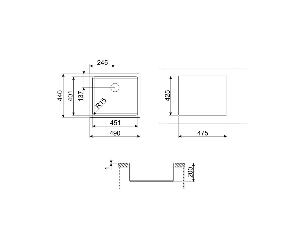 Smeg VFU40SFR Lavello da Incasso 1 Vasca Monovasca 44 x 44 cm Filotop - Flat - Sottotop Acciaio Inox Spazzolato Estetica Universale Serie Mira